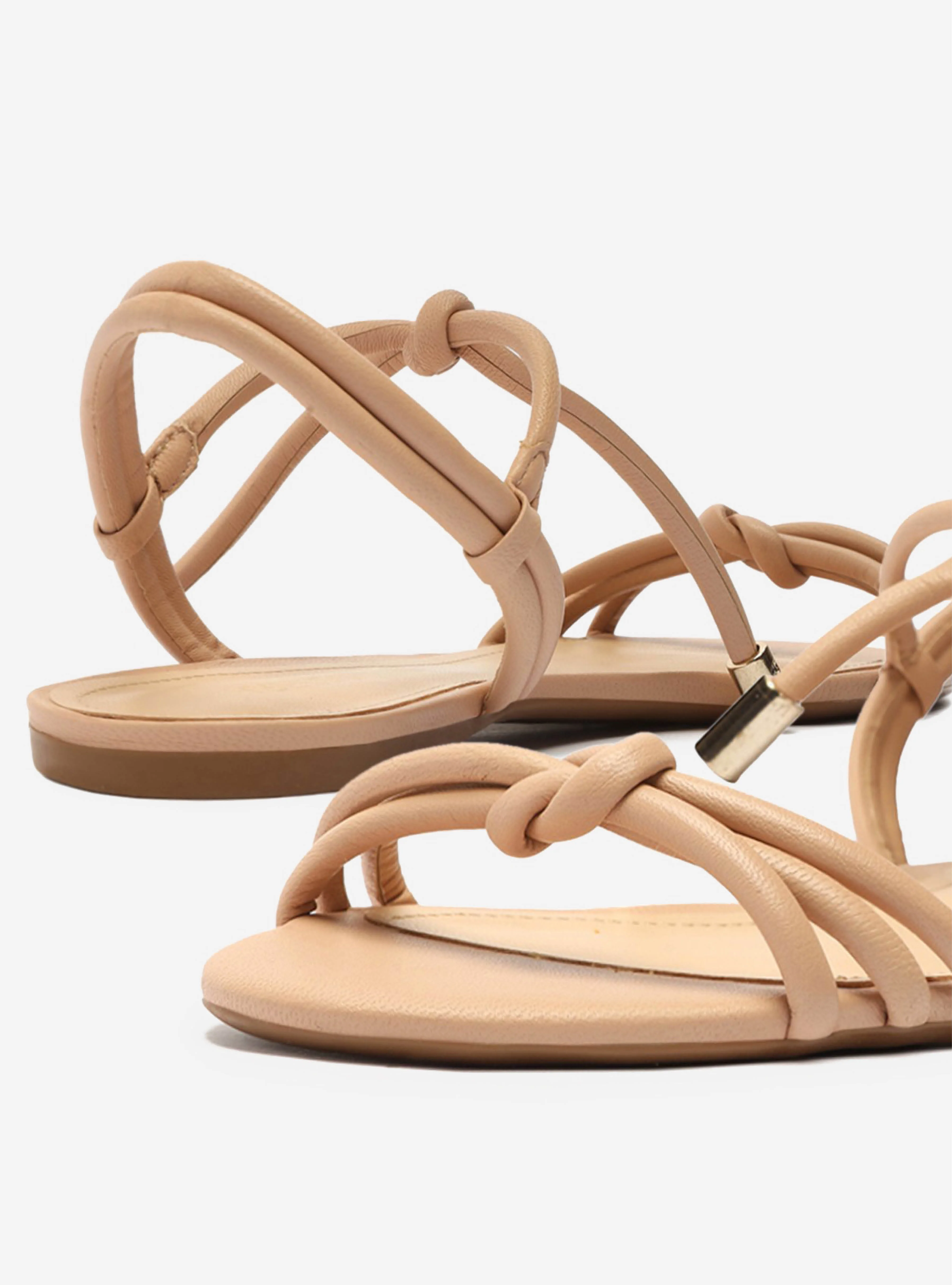 Nude leather sandal. The model features a flat sole, a round toe, and three thin straps over the toes joined in a central knot. It has a thin strap around the heel and two metallic-tipped ankle straps. With a front knot closure, this sandal has the inscription of the brand's name and reveals the entire foot.