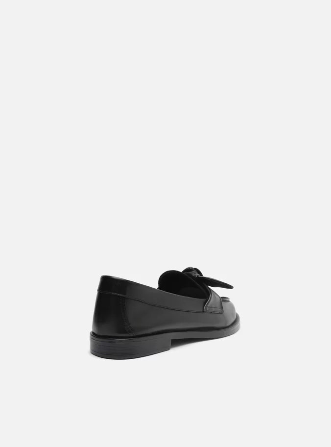 Black leather loafer. The style features a flat heel, a black sole, and a rounded toe. It is closed with a lateral cutout on the vamp and leather straps tied in a knot on the upper. It has prominent stitching along the front contour of the upper. The loafer shows the instep.