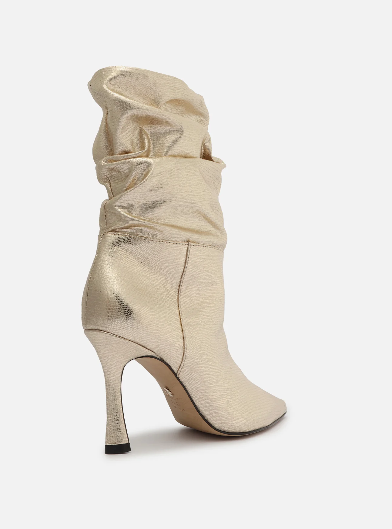 Gold boot. The style features a slouchy shaft and a stiletto heel. It has a pointed toe and a snug-fitting vamp with no closure.