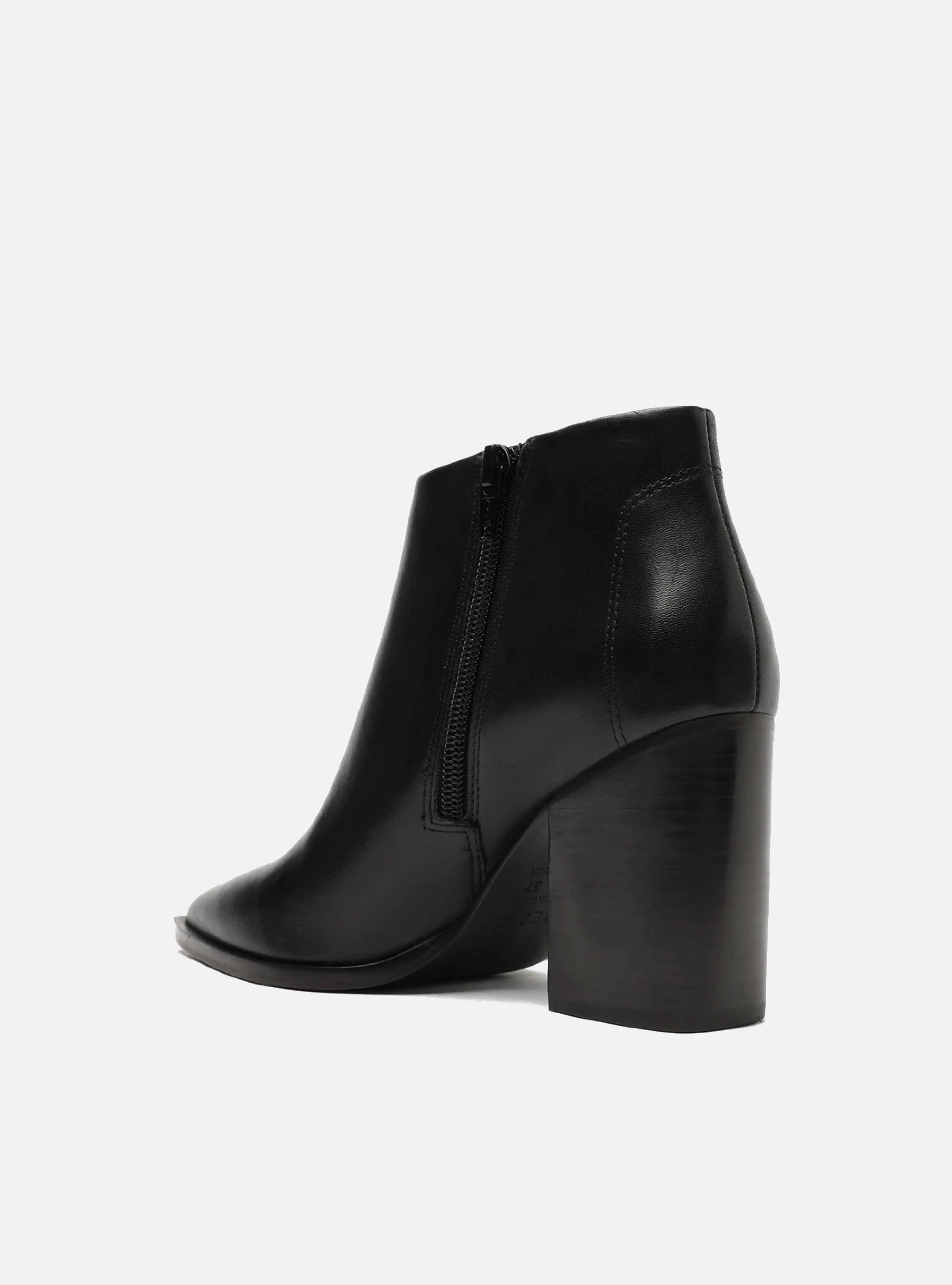 Black leather ankle boot. The style features a Mid block heel, and pointed toe. It has a snug-fitting vamp and a zipper closure on the inner side. With a cut-out detail on the shaft.