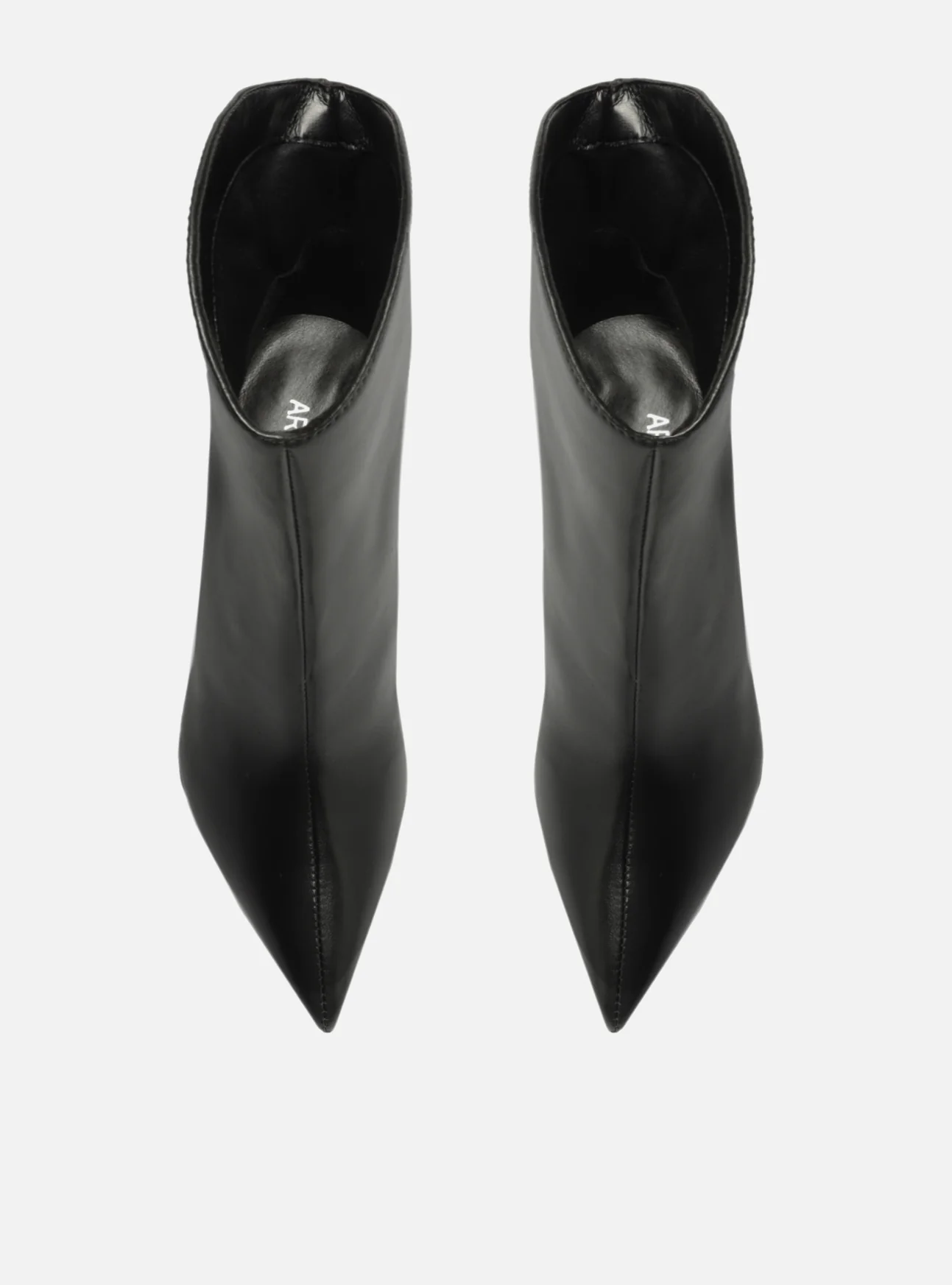 Black leather boot. This ankle boot features a block heel and a pointed toe. It has a snug fit around the foot and does not have a closure. With a rounded cut-out at the top of the shaft.