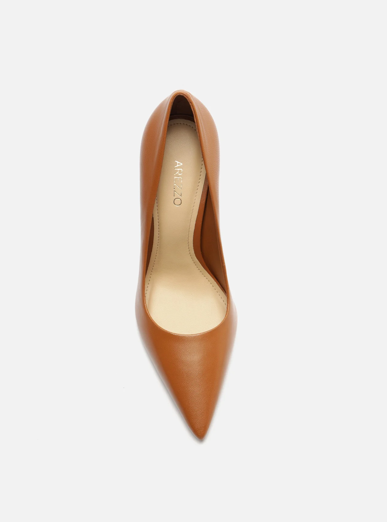 Brown pump. The style features a high stiletto heel and a pointed toe. It is closed with a rounded cutout on the upper over the instep, and a snug fit on the sides. With an insole in the same color as the sandal and the brand name engraved, it shows the instep.