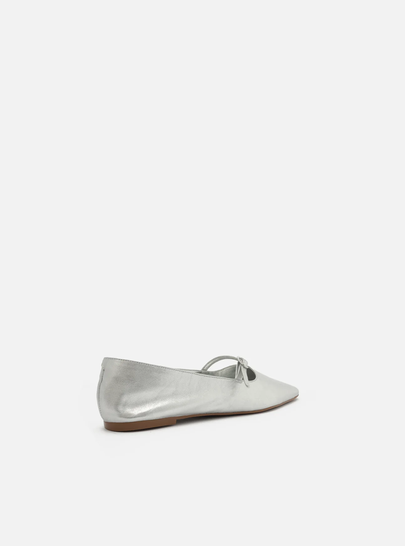 Silver leather ballet. The style features a flat heel and a square toe. It has a straight-cut upper, a buckled strap over the instep, and a snug fit along the sides. It also has a closed-toe design and shows the instep.