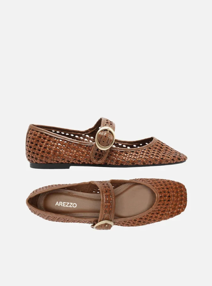 Brown ballet flat with woven and perforated design. The style features a flat heel, a rubber sole, and a square toe. With a closed-toe design, it has a rounded cut detail on the upper and a wide strap across the instep with a large, gold, oval buckle closure at the side. The ballet flat shows the instep.