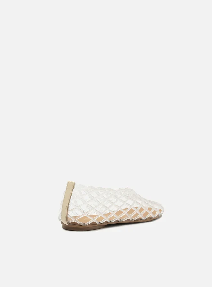 White ballet flat. Introducing the perfect blend of style and comfort: our women’s white ballet flats! Featuring a chic rounded toe and a low heel, these shoes showcase a wide, airy woven upper that beautifully highlights your feet, complete with a stylish opening at the top. The back is secured with a sleek strap, and the beige insole proudly displays our brand name.