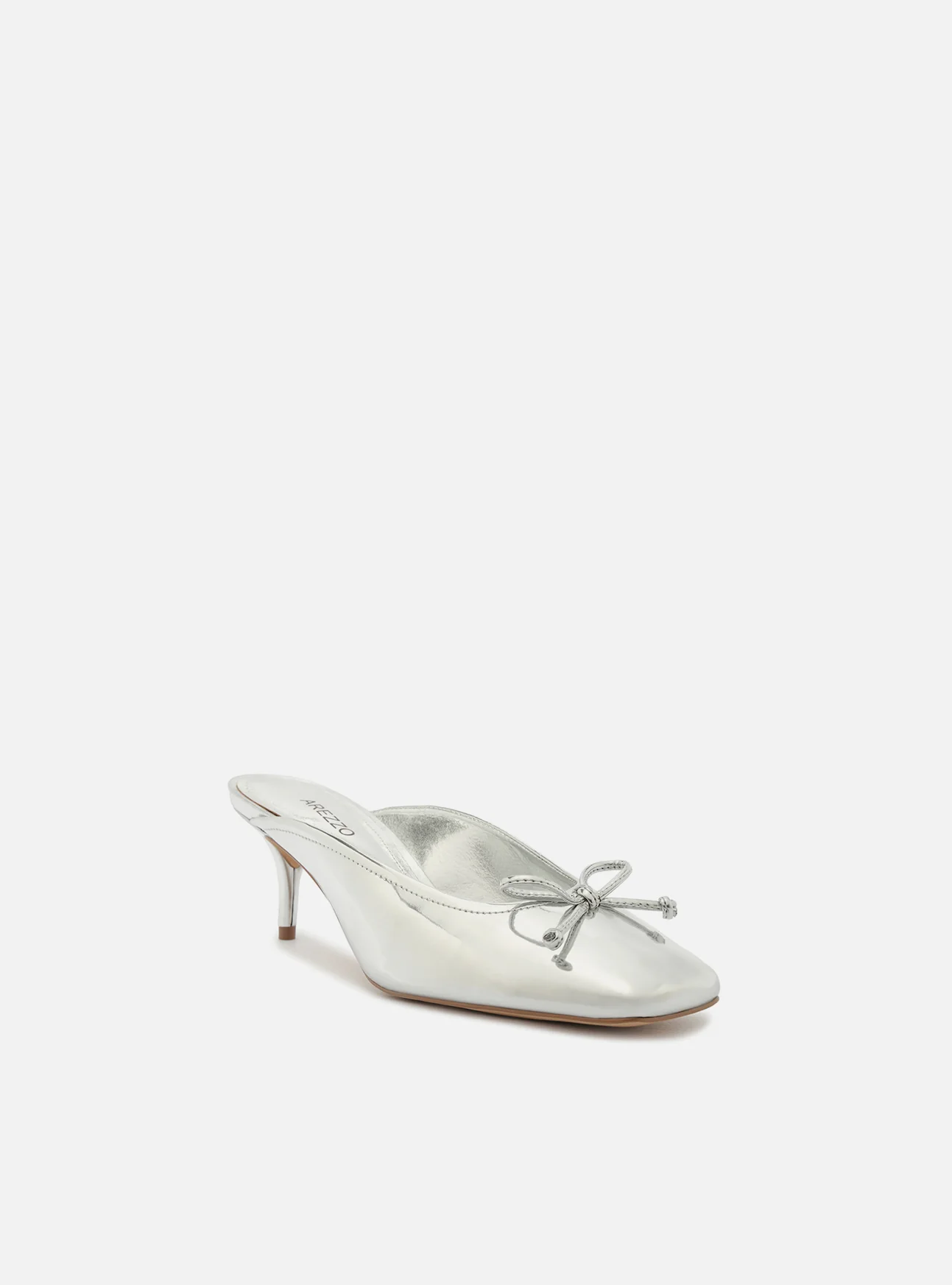 Silver leather mule. The style features a low stiletto heel and a square toe. It has a rounded-cut upper with a small bow embellishment. The mule is open-back and shows the instep and the back of the foot.