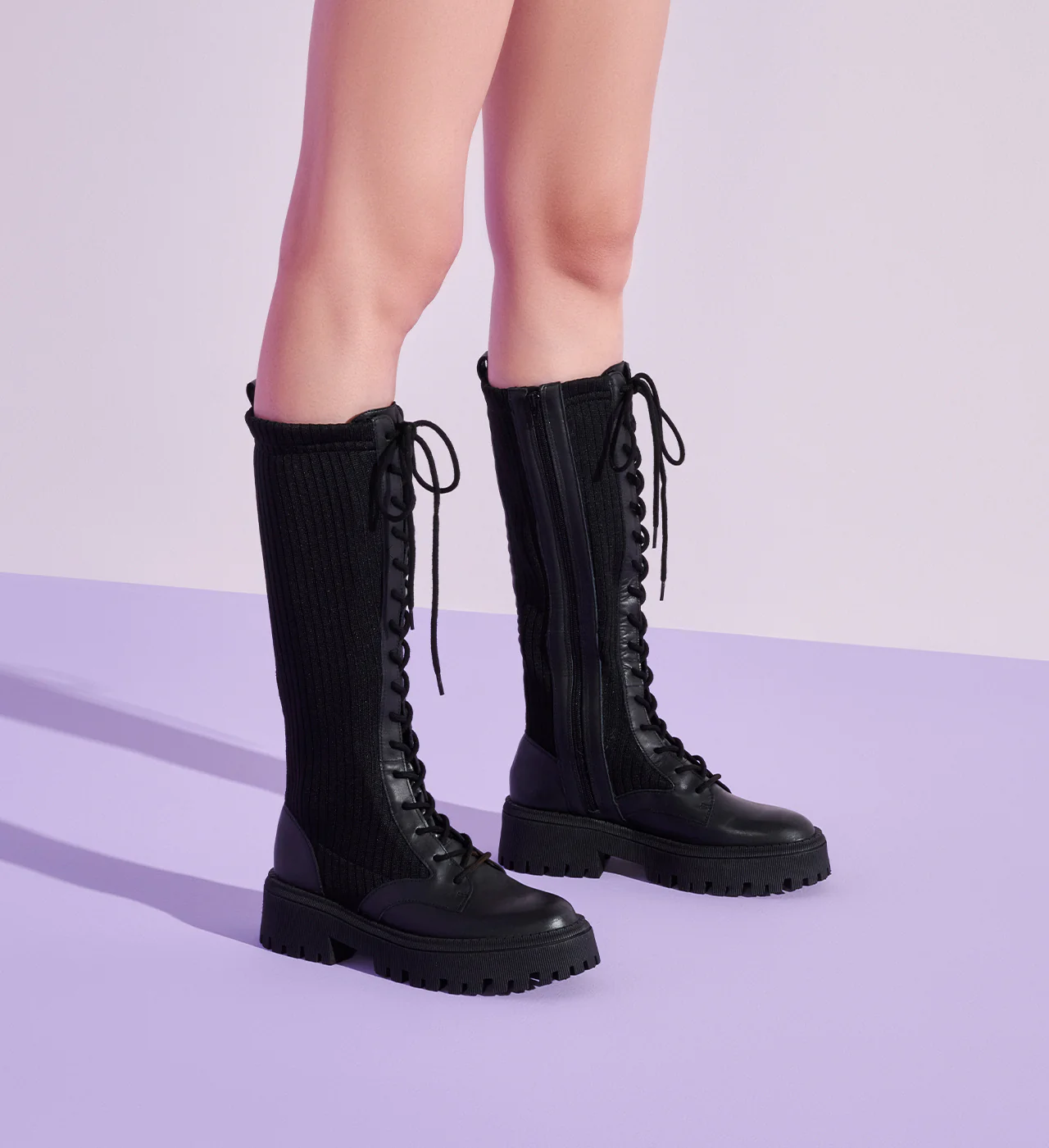 No more of the same with this lug sole, knee-high combat boot. Long black laces define LUP for an ultra edgy appeal.
