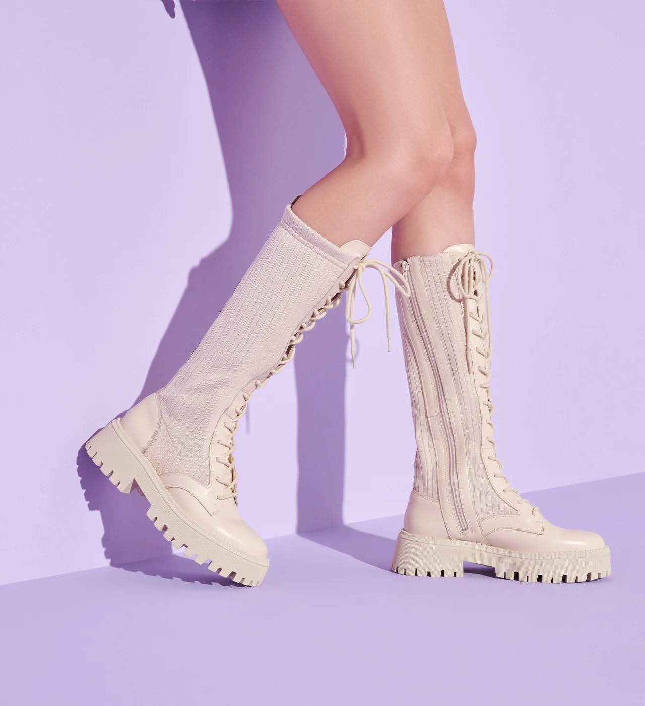 No more of the same with this lug sole, knee-high combat boot. Long panacota laces define LUP for an ultra edgy appeal.