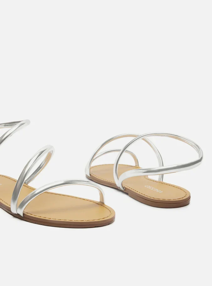 Silver sandal with a high-shine finish. The model features a flat heel and a round toe. It has a thick strap over the toes and another diagonal strap across the instep. Additionally, there is a thick strap that extends from the side and wraps around the heel. The sandal is open, showcasing the entire foot, and has a brown insole with the brand's name inscribed.