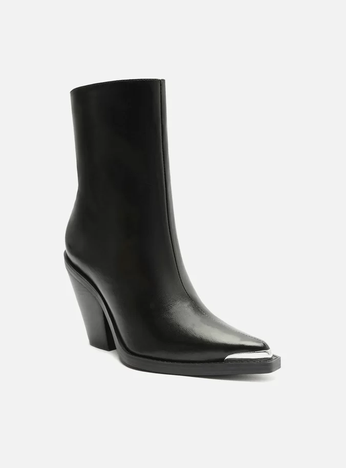 Block heel black leather boots. The style features a short shaft, a high stacked block heel, and a pointed toe. It has a snug fit and a zipper closure on the inner side of the shaft. With a metal application on the toe cap.