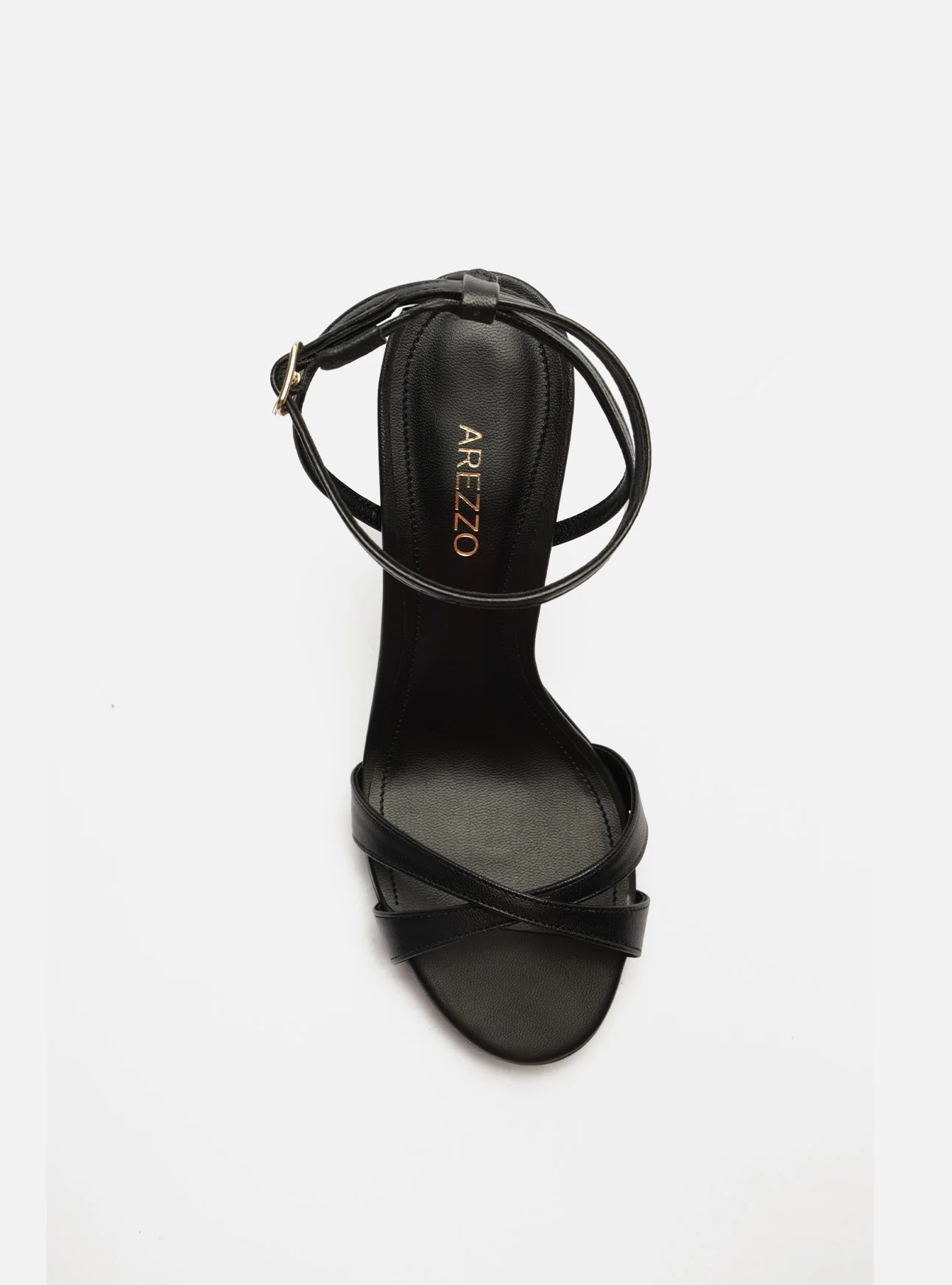 Black sandal. The style features a high slender heel, a platform heel, and a rounded toe. It has two crossed straps over the toes. There is a thin strap that emerges from the sides, crosses at the heel, wraps around the ankle, and fastens with a side buckle. With the insole in the same color as the sandal and the brand name engraved. The sandal shows the foot.